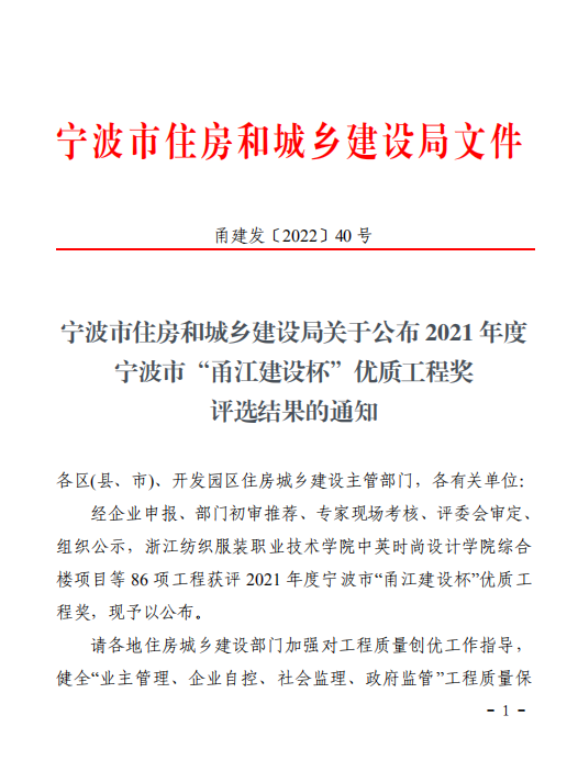 我院兩項工程榮膺2021年度寧波市“甬江建設杯”優(yōu)質(zhì)工程獎