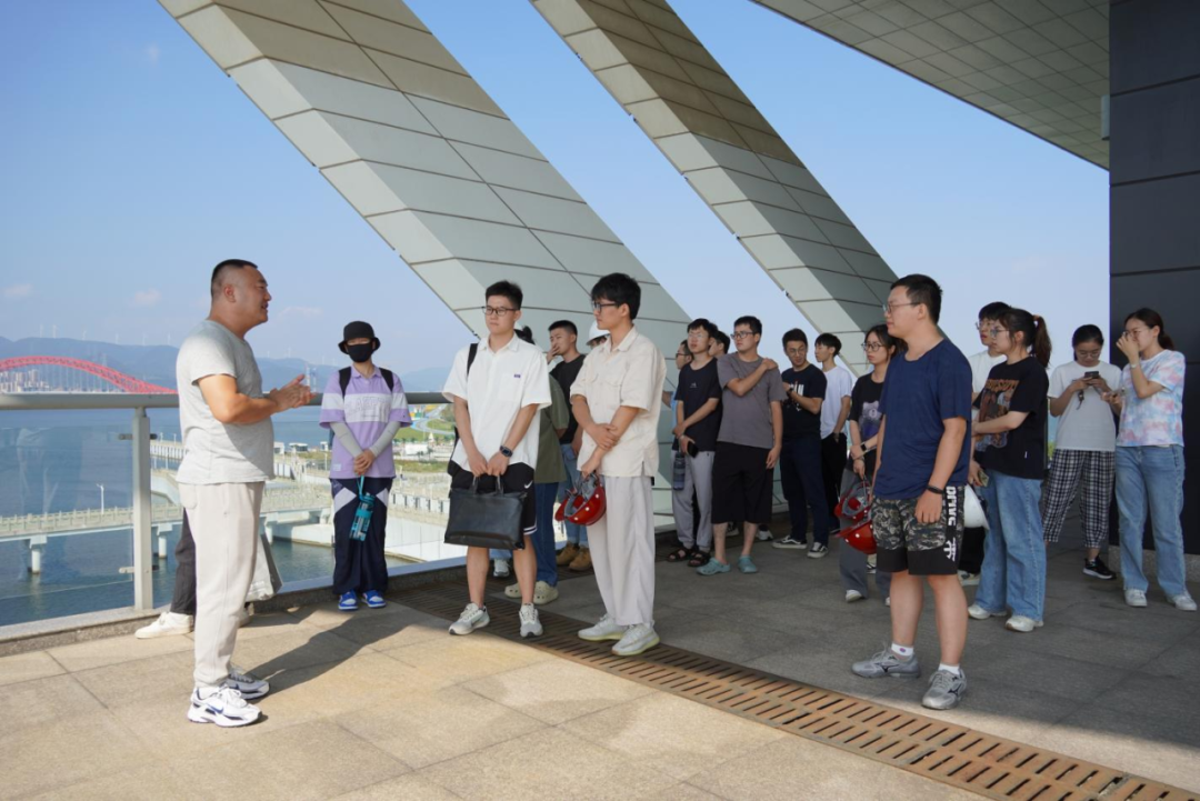最后,研學(xué)隊(duì)伍來(lái)到北堤樞紐參觀。該工程榮獲中國(guó)建筑行業(yè)工程質(zhì)量的最高榮譽(yù)獎(jiǎng)——2020-2021年度第一批中國(guó)建設(shè)工程魯班獎(jiǎng)。胡經(jīng)理帶領(lǐng)研學(xué)隊(duì)伍依次進(jìn)入啟閉機(jī)房、觀景臺(tái)、控制室等處,現(xiàn)場(chǎng)講解工程設(shè)計(jì)思路、建造工藝和管理要點(diǎn)。
