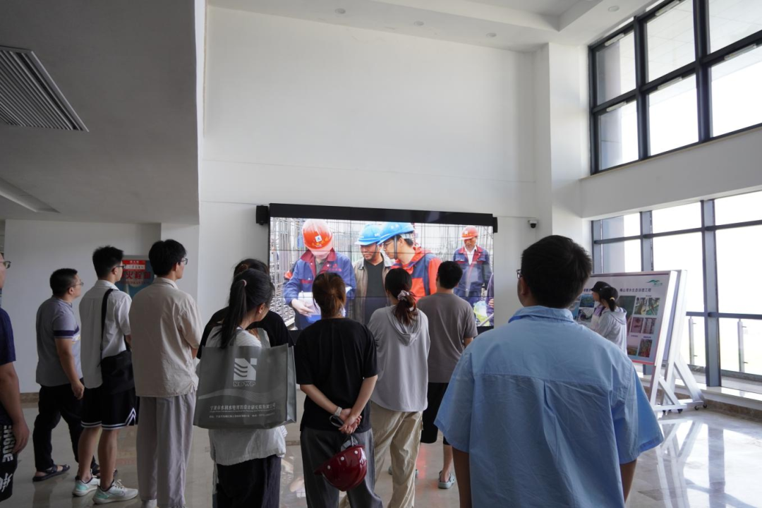 梅山灣外,銀浪拍岸;梅山灣內(nèi),碧波含翠。首先,研學(xué)隊(duì)伍到達(dá)梅山灣建設(shè)管理中心,跟隨工作人員登樓參觀,眺望南堤樞紐及附近設(shè)施,聆聽(tīng)工程總體建設(shè)情況,并觀看宣傳片,了解該工程的誕生始末。